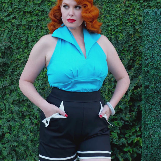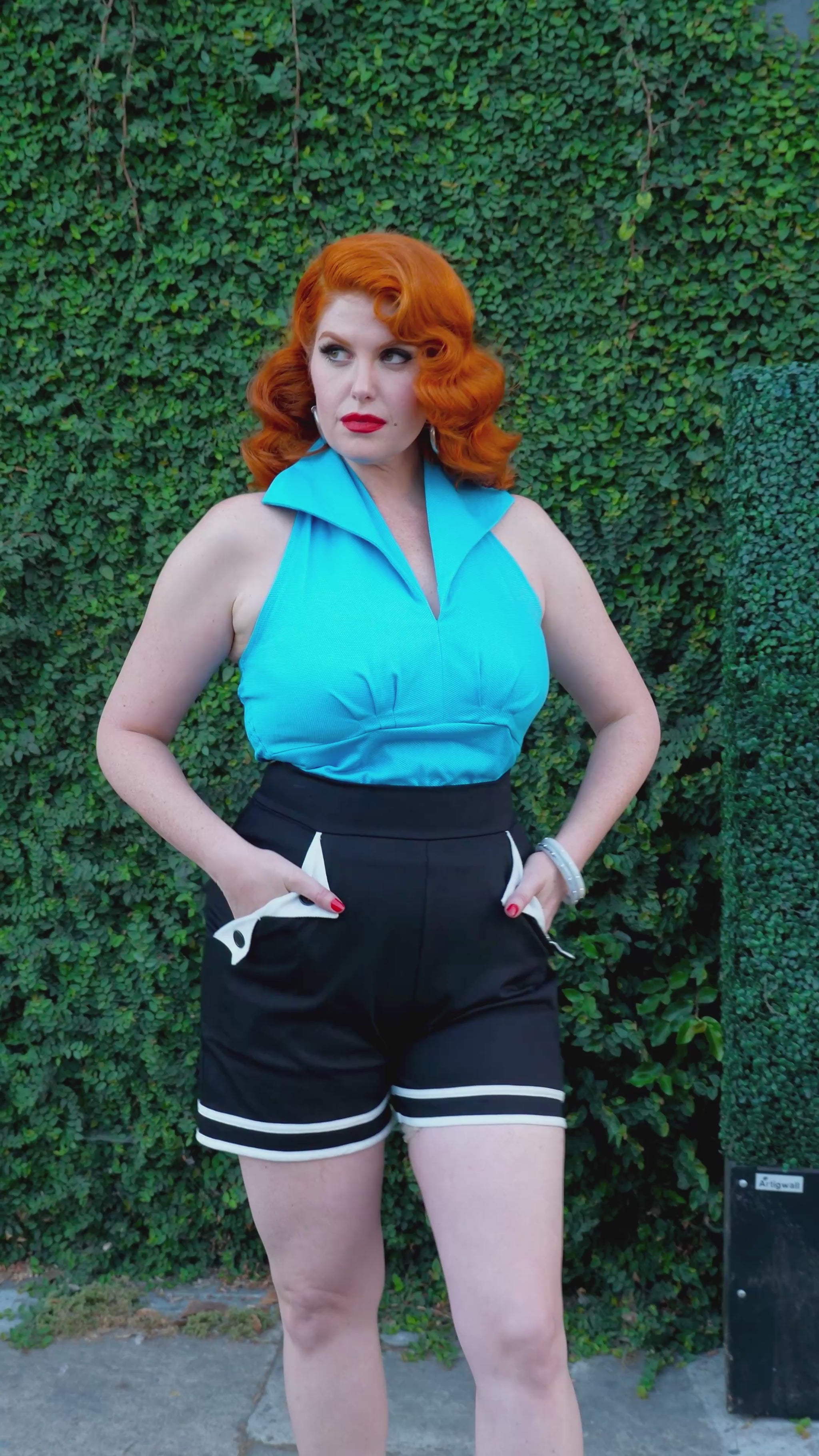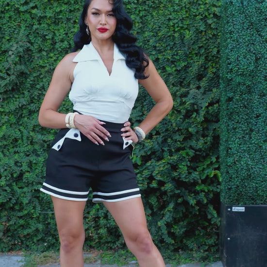 The Daywear Dolly Shorts offer a versatile addition to your daily wardrobe. Wear them at the modest length provided or cuff the hems for a bolder style. They feature charming triangle cut-out accents on the functional front pockets. A metal zipper at the back. Crafted from premium cotton twill with just the right stretch, these shorts include a 1.5" waistband designed to shape and accentuate the waist. The contrasting white accents are pique cotton.