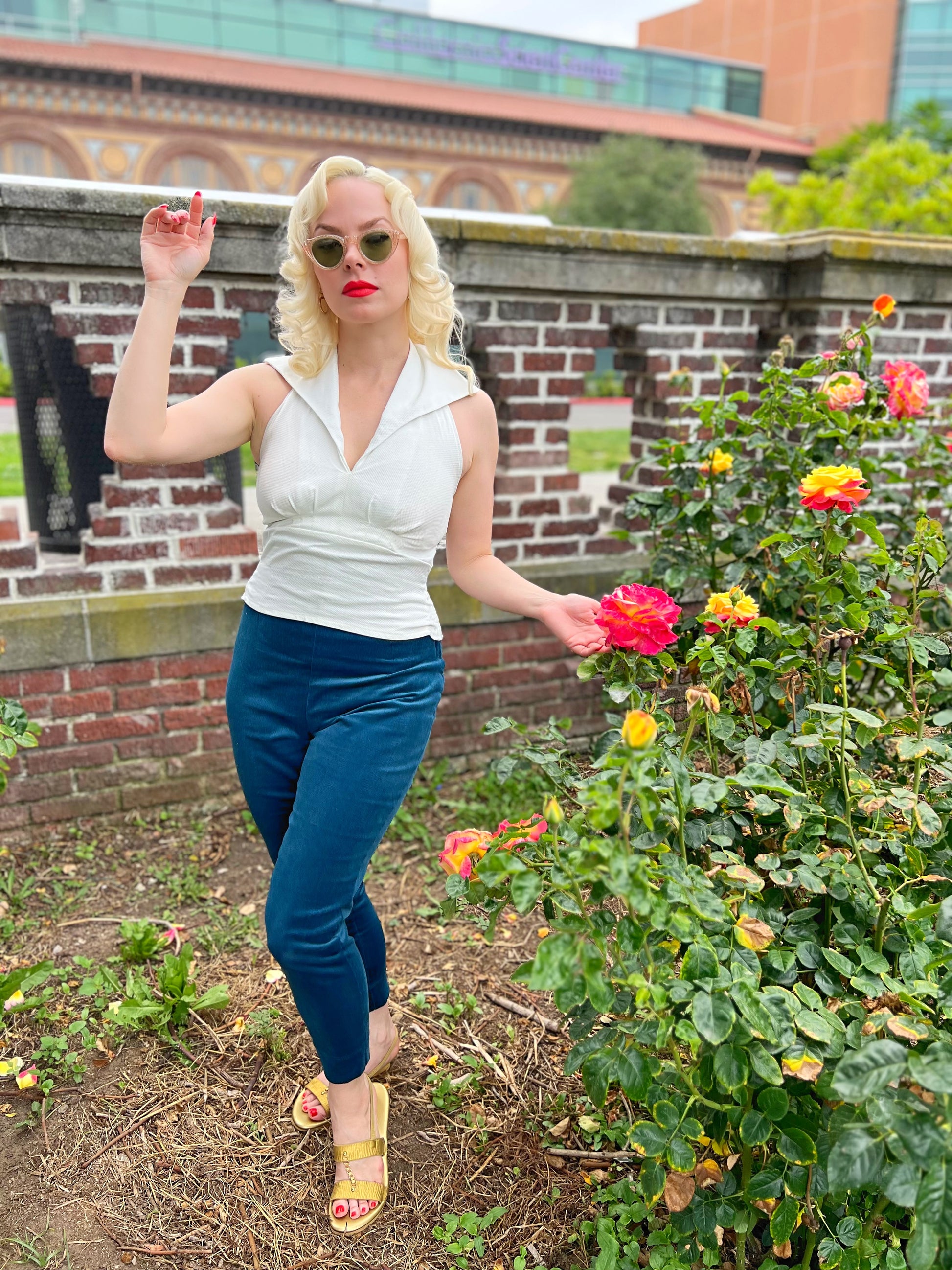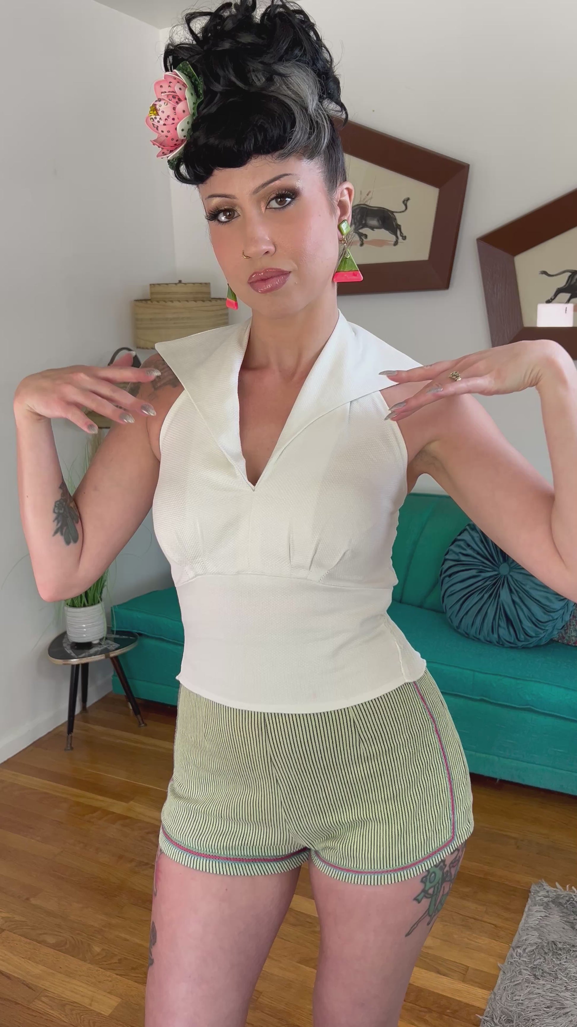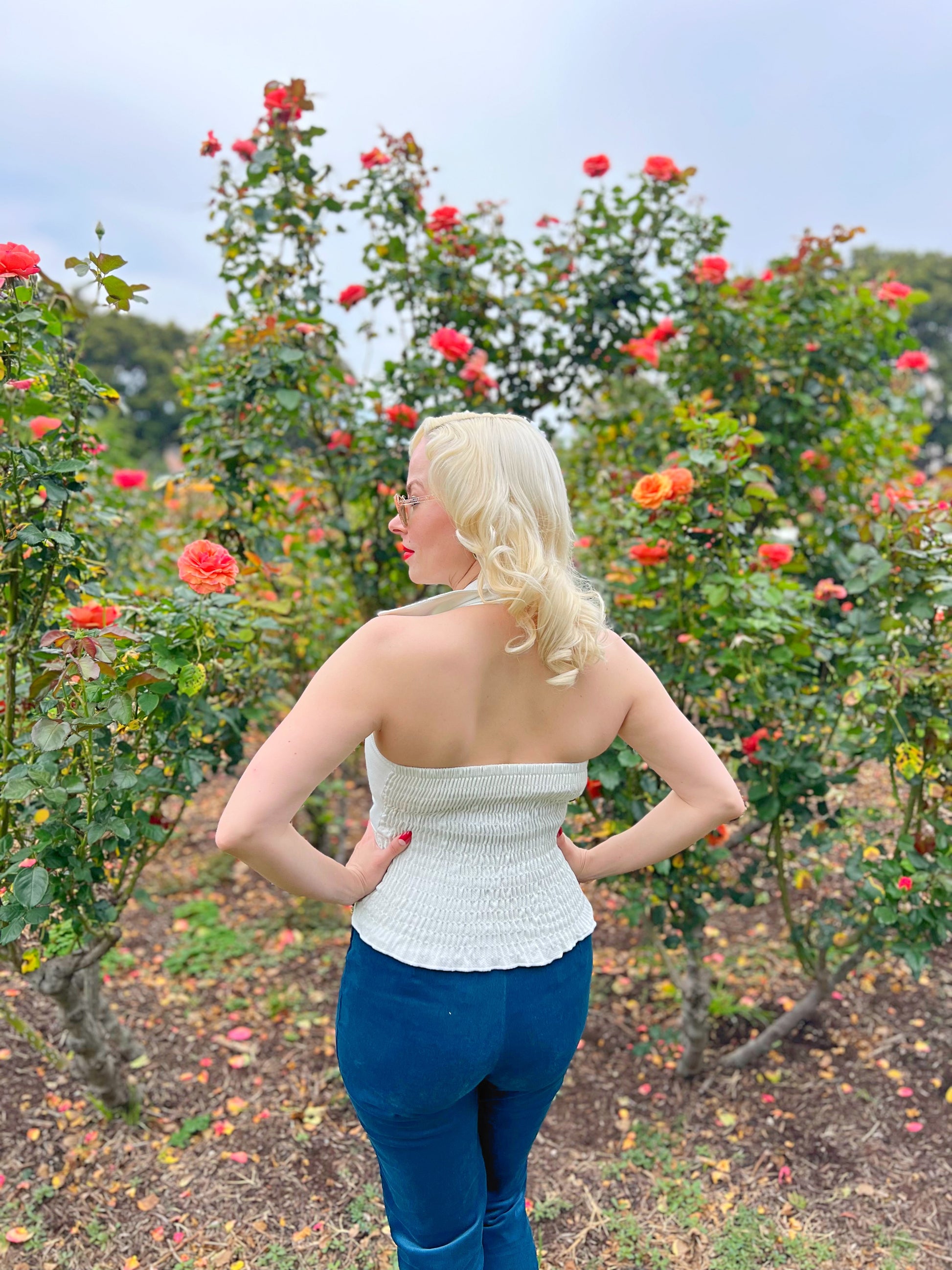 The Pinup Halter Top is an essential piece for any pinup's wardrobe. This halter boasts an exaggerated collar and a plunging V-neckline, while the back is fully smocked for a secure fit. This top has no zipper and instead effortlessly pulls over the head.