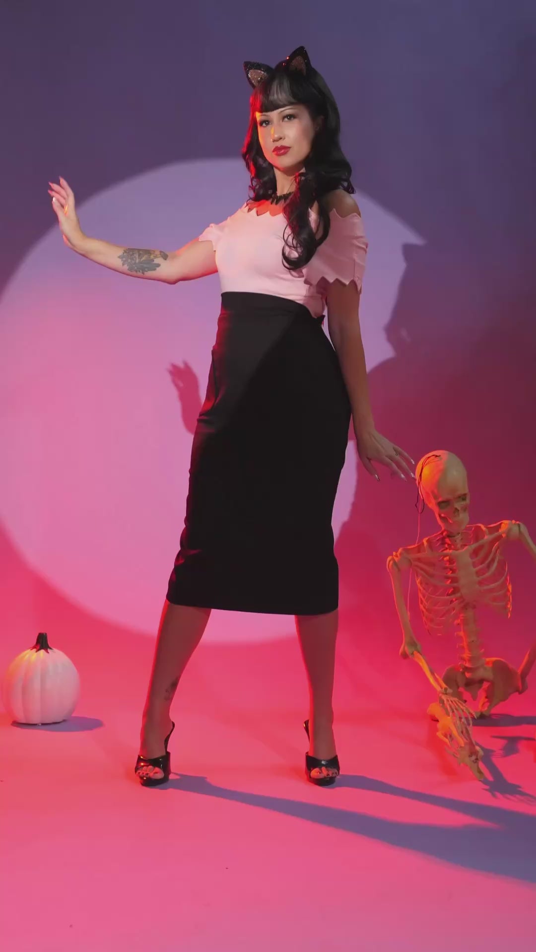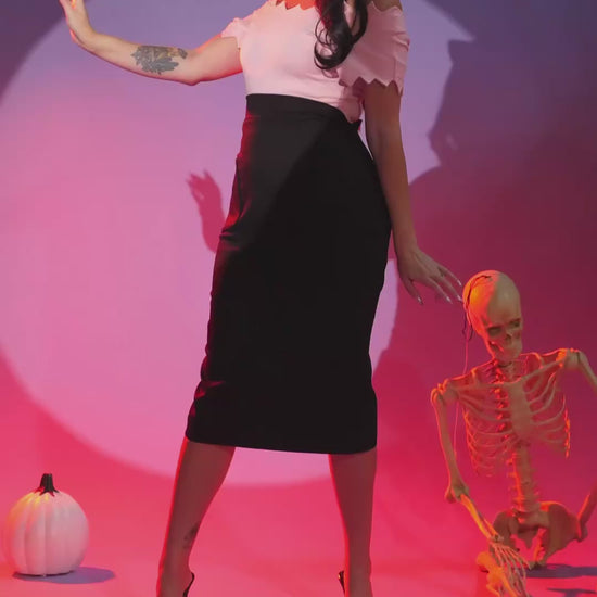 Introducing our Shark Bite Top, featuring playful jagged edges around the neckline and armholes. Drawing inspiration from the kitschy midcentury style, this blouse slips on easily without any closures or zippers. Crafted from durable yet soft Ponte fabric. The color is a light pink; this color is a limited release and only an exclusive quantity was produced, don't miss it!