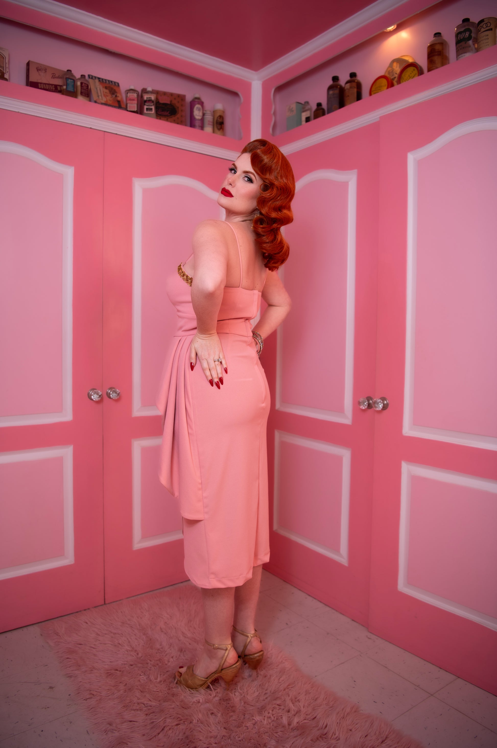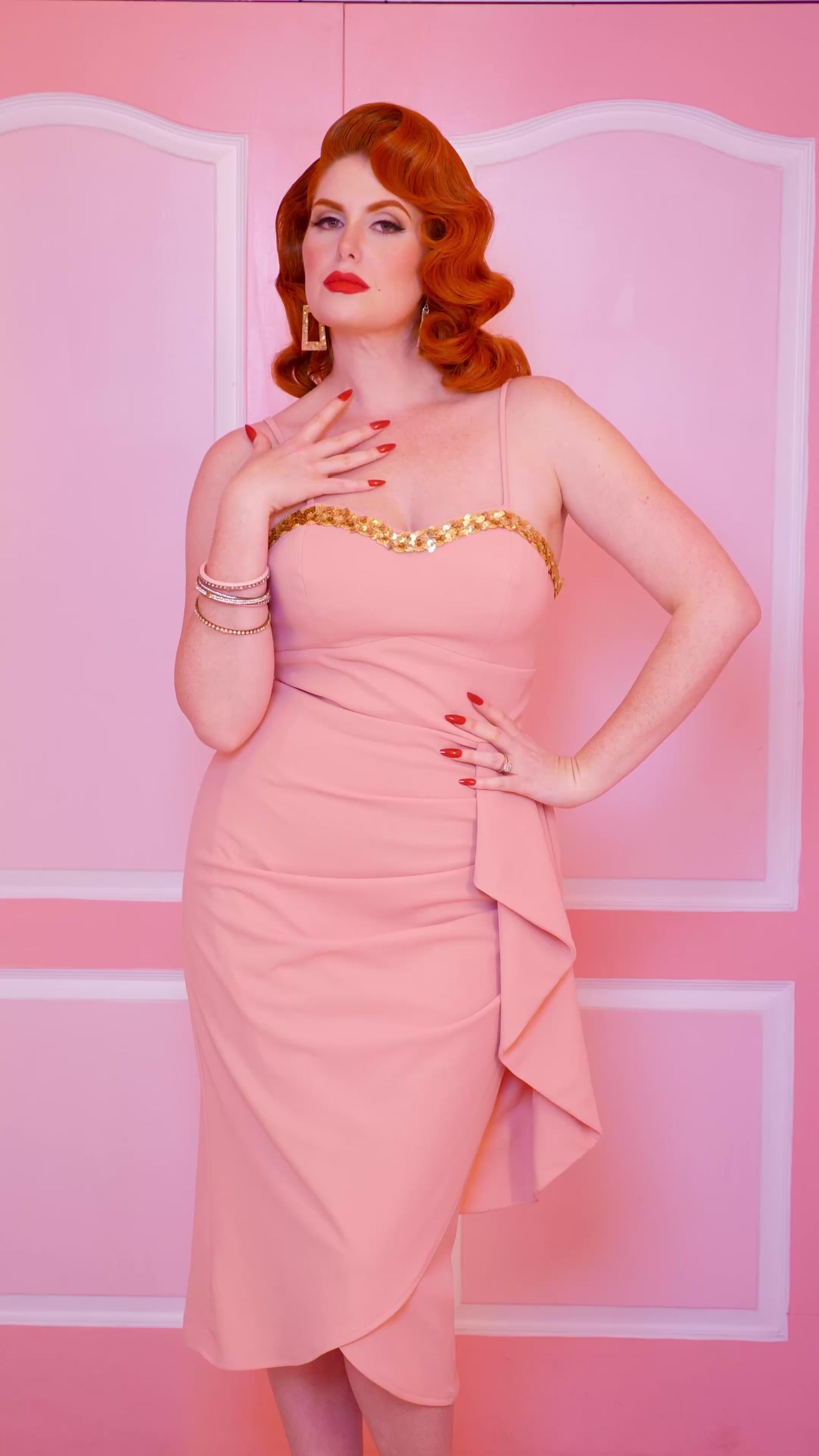 The Shimmering Sarong in Pink is a classic dress that is suitable for all seasons, not just Spring. The timeless sarong style is enhanced with a touch of glamour through the addition of sequin gold trim along the sweetheart bustline. The dress is equipped with a lined bodice, draped sarong skirt with hip swag, and a back metal zipper. This dress offers everything you need. Its pink version is crafted from a high-quality poly spandex blend that provides both form-fitting support and comfortable stretch. The color is a very light pink.