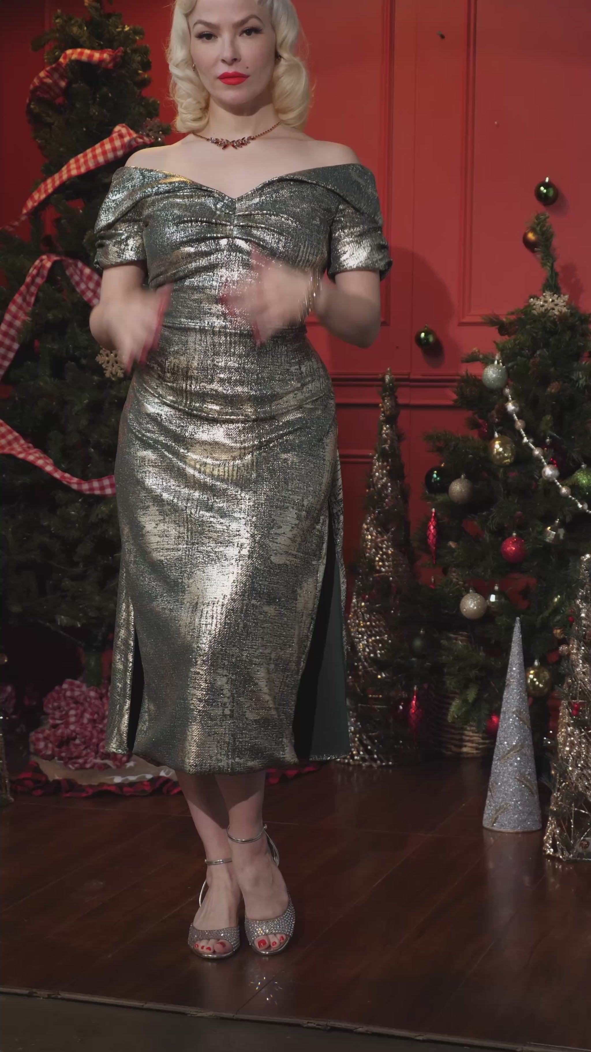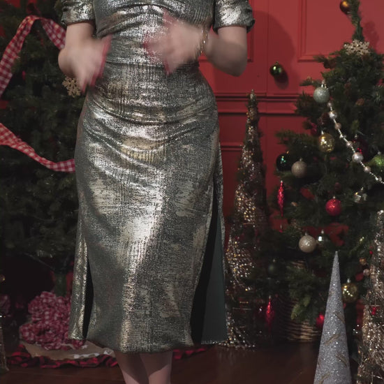 The Bliss dress is back in GORGEOUS GREEN SPARKLE! Features an extra plunging neckline and distinctive folds in the bodice placed perfectly aligned with your shoulders. The center bustline features a gather to give shape. The waist is a wasp waist to give you a cinched look. The glamour on this dress is not only in the fabric, but in the flowing beautiful train on the back. Includes a metal zipper located on the back of the dress. The fabric is a metallic jersey knit in a deep green color with gold/silver metallic notes. This fabric does have some stretch.