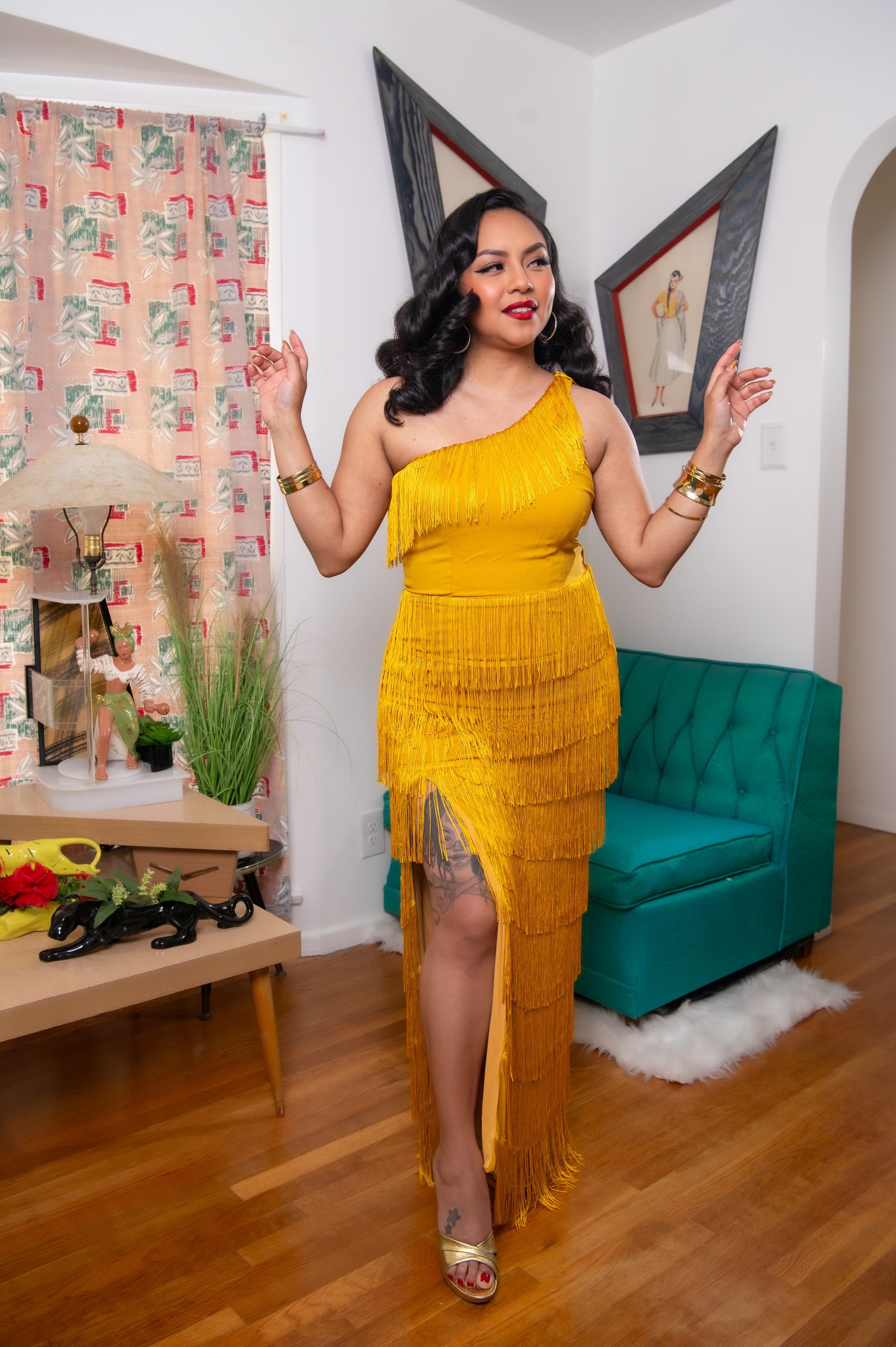 Introducing our Showstopping Gypsy Fringe Dress! The ultimate FRINGE Dream! This dress is almost completely covered in fringe! The placement of the fringe was precise. We left just enough of the actual dress visible, to show off the wasp waist and leg with the slit opening. The one shoulder bodice replicates the true vintage style we were aiming to capture. The long-fitted skirt features a high slit to show off those gams! The Gypsy Dress is so much fun to wear, dance and shake it in! The dress is fully lined. The base of the fabric is Crepe*. Please note the fabric does have give. This dress will be available in (3) colors: black, red and gold.